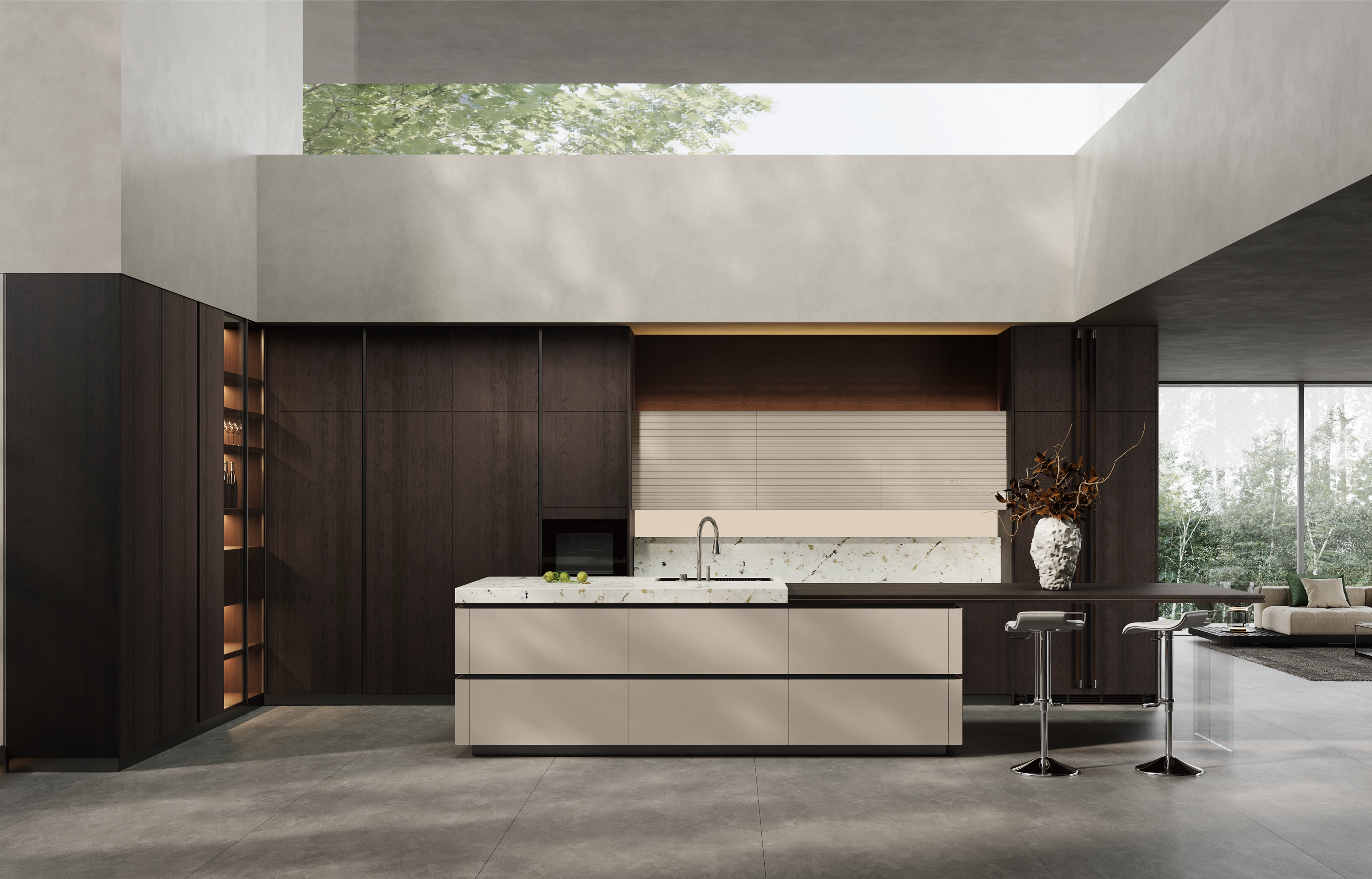 通过PP电子厨柜量体裁柜,定制出适合主厨下厨的烹饪区和洗涤区的舒适高度。